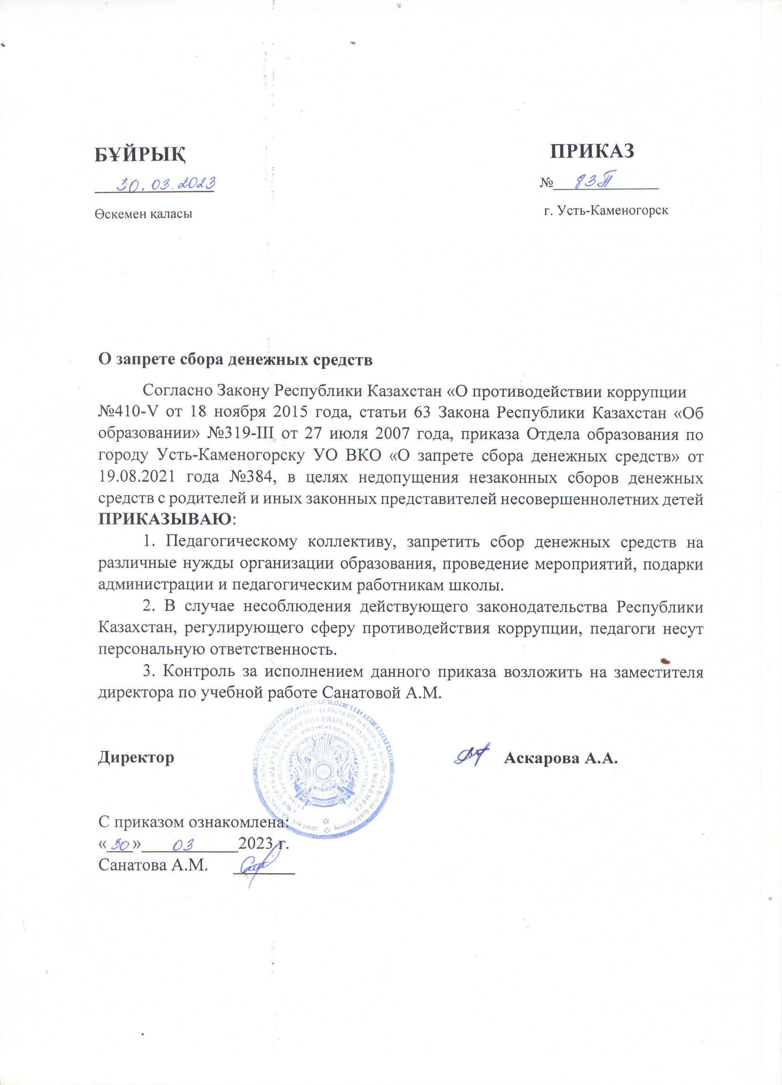 Білім алушылардың ата-аналарынан заңсыз ақша жинауға тыйым салу туралы / О запрете незаконного сбора денег с родителей учащихся » Средняя школа №6