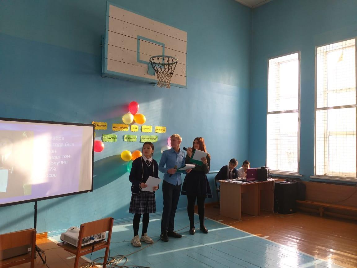 25 қараша күні мектебімізде тұңғыш президент күніне арналған салтанатты жиын өткізілді. Жиынның мақсаты оқушылардың тұңғыш елбасыларының тарихын білуі, өз Отаны үшін сүйіспеншілік пен мақтаныш сезімдерінің артуы болды. Жиында оқушылар ән айтып, би билеп, әдеби өлеңдер оқыды. Сондай – ақ, Президентіміз, басшылығы барысында ең алдымен, мемлекеттің тәуелсіздігін дүниежүзілік қоғамдастық мойындауына қол жеткізгендігі жөнінде айтылып өтті.
