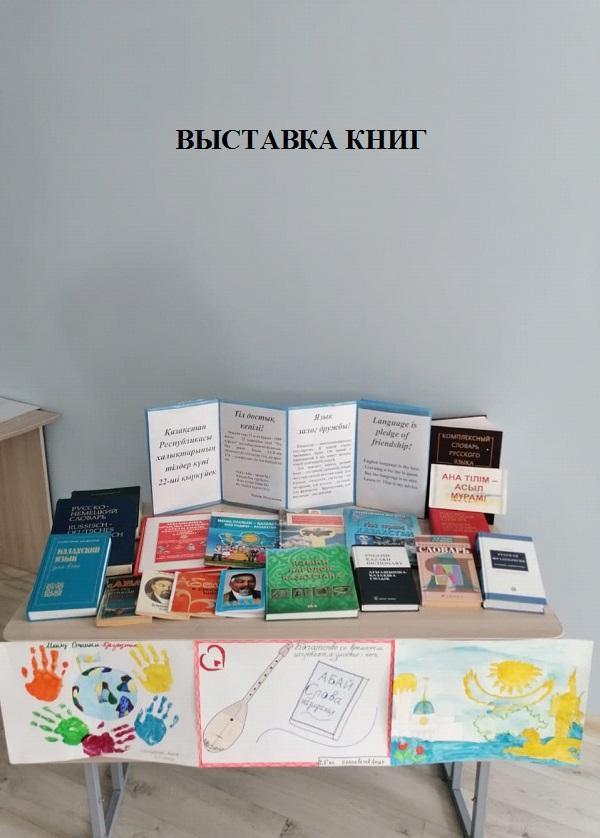 Проводились различные мероприятия в онлайн формате: выставка книг «Өзге тілдің бәрін біл, өз тіліңді құрметте» , круглый стол с учащимися 9-11 классов на тему «Единство языков — основа единства народа Казахстана», «Юнный полиглот» с участием 4-х классов, конкурс стенгазет, коллаж «День языков народов Казахстана» среди 5-7 классов , сочинения на тему «Язык — живая душа народа» среди учащихся 6-10 классов, для учащихся 6-10 классов конкурс чтецов, «Туған тіл тірлігімнің айғағы» викторины с учащимися 5-8 классов. Ученики приняли активное участие в конкурсах