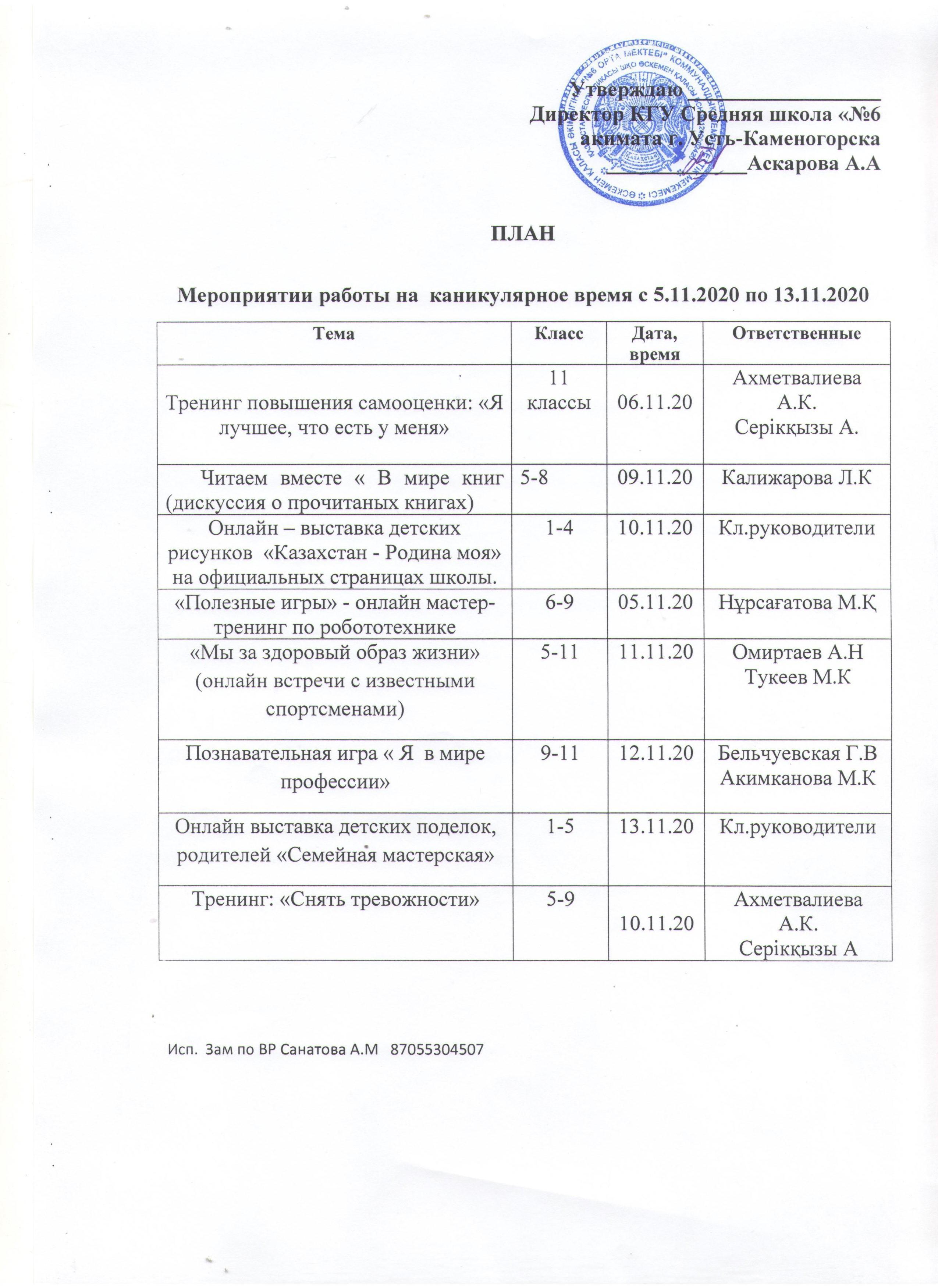 04 қараша 2020 0 1 2 3 4 5 План мероприятий на каникулярное время План мероприятий на каникулярное время с 5.11.2020 по 13.11.2020
