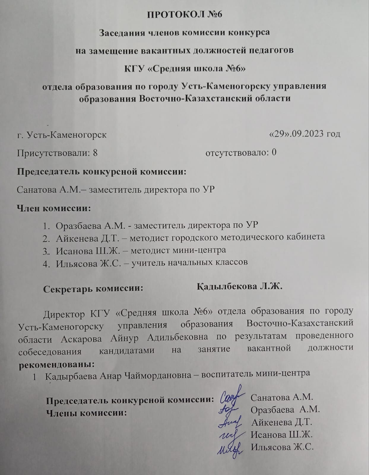 29.09.2023 г. проведен конкурс по приему педагогов в КГУ "Средняя школа № 6 " отдела образования по городу Усть-Каменогорску управления образования ВКО согласно приказу Министра образования и науки Республики Казахстан от 21 февраля 2012 года № 57 «Об утверждении правил назначения на должности, освобождения от должностей первых руководителей и педагогов государственных организаций образования».