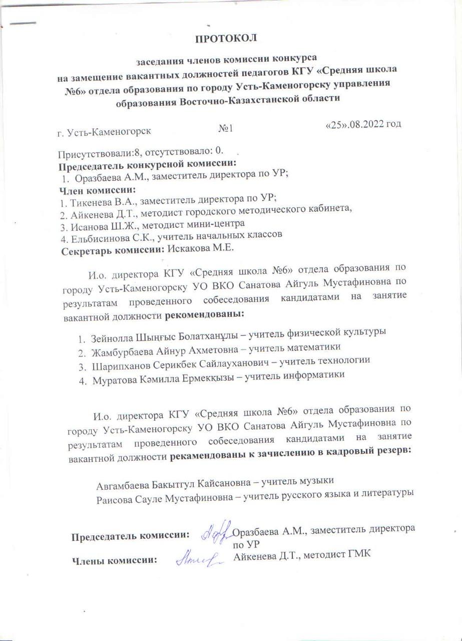 Бос жұмыс орындарына конкурстың қортындысы » Средняя школа №6