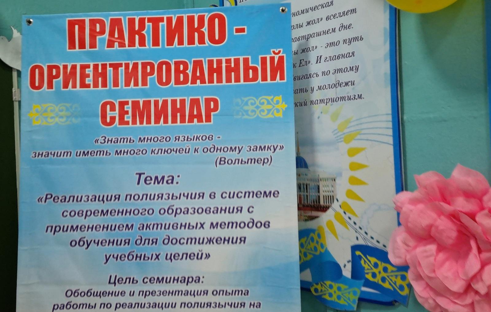 Семинар барысында мектеп әкімшілігі МІБ бойынша көптілдіктің қалай жүзеге асырып жатқандығы туралы іс-тәжірибелерін көрсетті. Орыс тілі мен әдебиеті пәні мұғалімі – Кабдыракова Айнур Бахтияровна 9-сынып оқушыларымен ашық сабақ өткізіп, шара соңында шеберлік сынып өткізу арқылы өзінің озық іс-тәжірибесімен бөлісті. Мектеп ұжымымен бірлесіп жасалған семинар жоғары деңгейде өтіп, қатысушылардың оң бағасын алды.