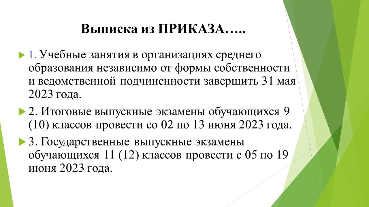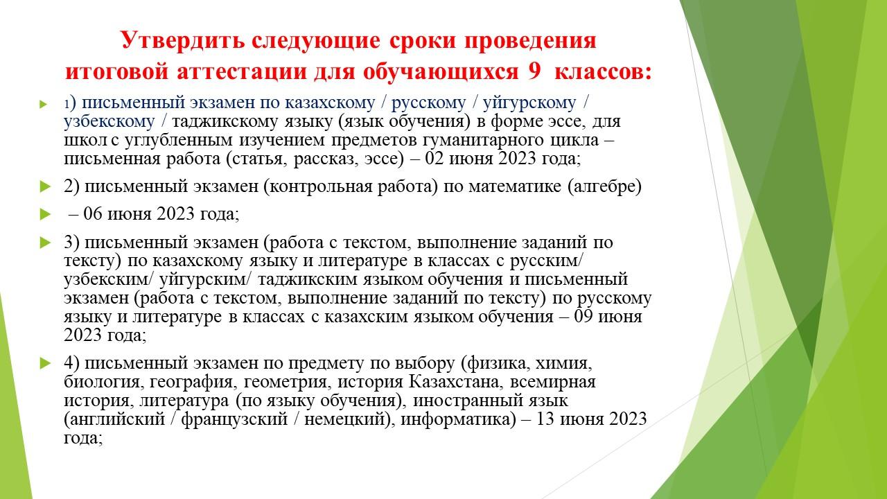» » » «2022-2023 оқу жылын аяқтау және орта білім беру ұйымдарында білім алушыларды қорытынды аттестаттаудан өткізу мерзімдерін бекіту туралы» / «Об утверждении сроков завершения 2022-2023 учебного года и проведения итоговой аттестации обучающихся в орга