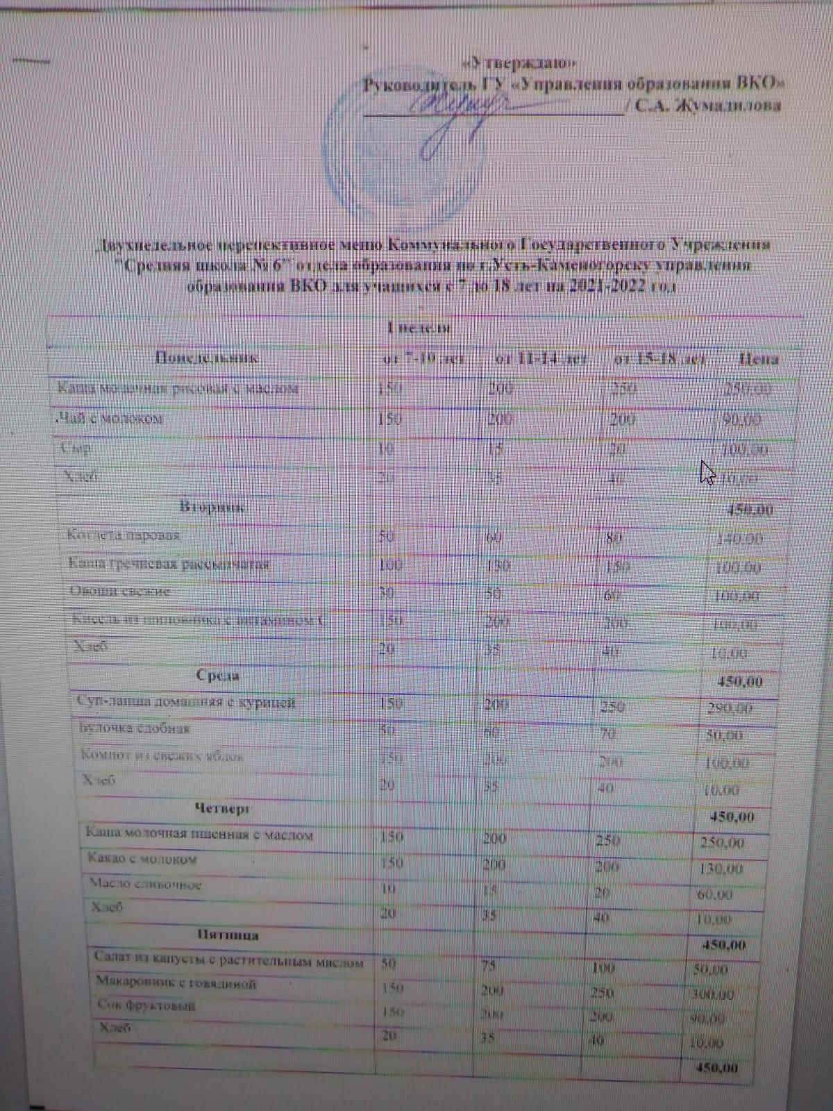 2021-2022 оқу жылындағы мектеп асханасындағы тағамдар тізімдемесі.Перечень блюд в школьной столовой на 2021-2022 учебный год. » Средняя школа №6