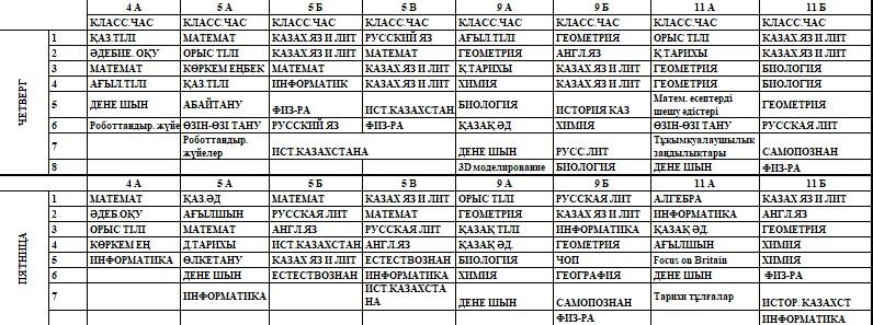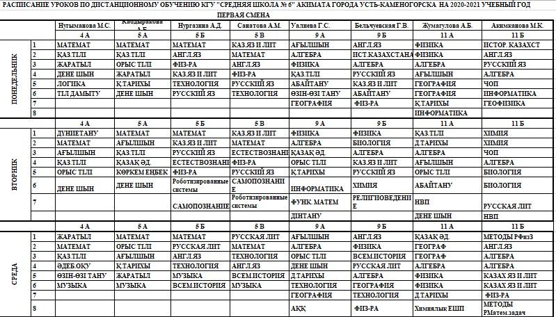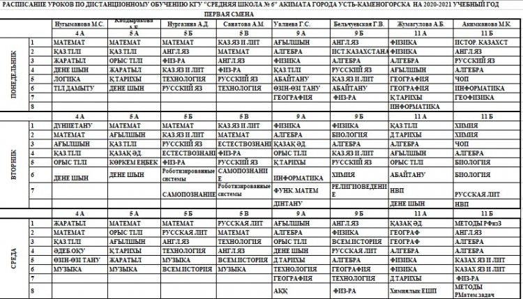РАСПИСАНИЕ УРОКОВ КГУ "СРЕДНЯЯ ШКОЛА № 6" АКИМАТА ГОРОДА УСТЬ-КАМЕНОГОРСКА НА 2020 УЧЕБНЫЙ ГОД (ПЕРВОЕ ПОЛУГОДИЕ) » Средняя школа №6
