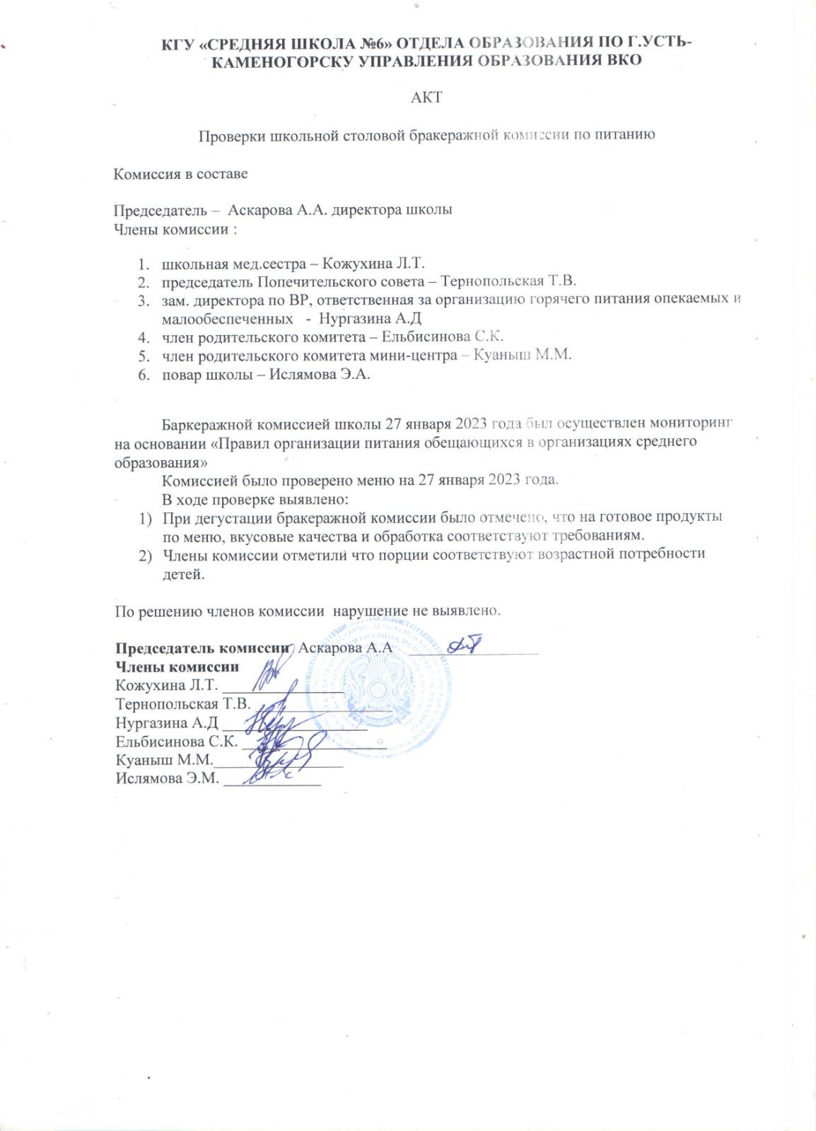 Мектепте бракераждық комиссияның жоспарына сәйкес тексерілу жүргізілді. Бракераж комиссияларының актілері / В школе согласно по плану ведутся проверки бракеражной комиссии. Акты бракеражных комиссии. » Средняя школа №6