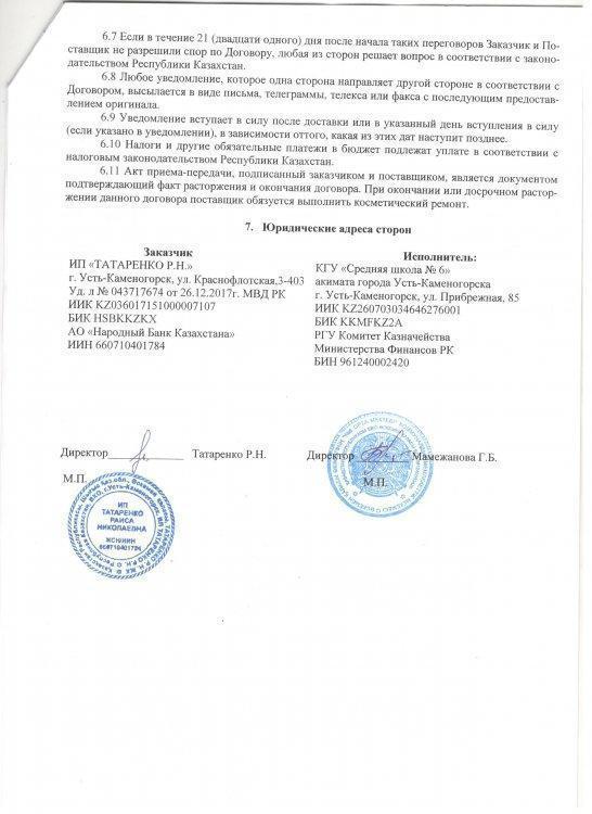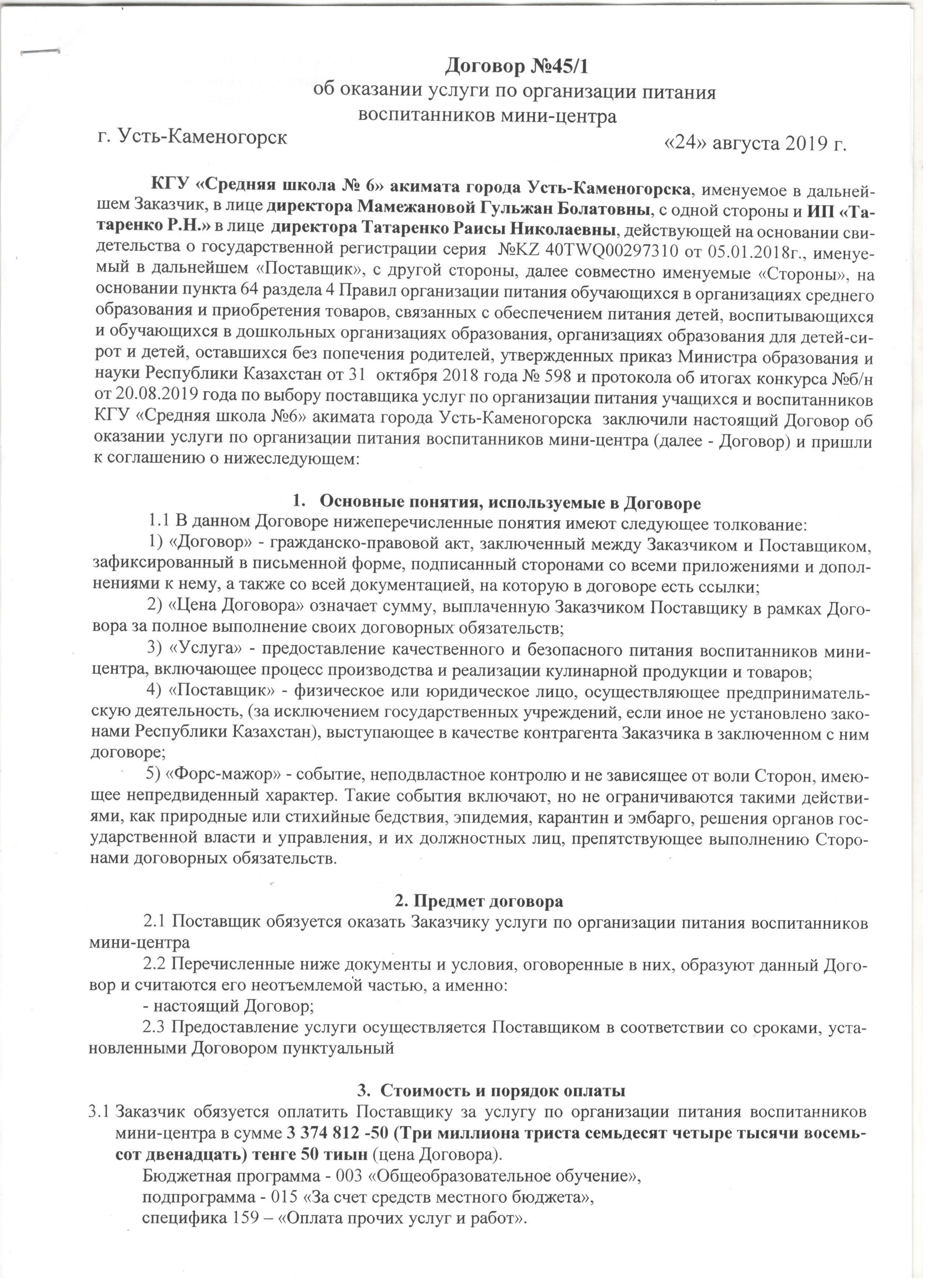 Шағын орталық тәрбиеленушілерінің мектеп асханасында тамақтануы туралы келісім шарт » Средняя школа №6