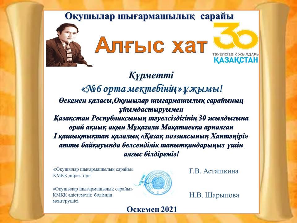 Қазақ поэзиясының Хантәңірі » Средняя школа №6