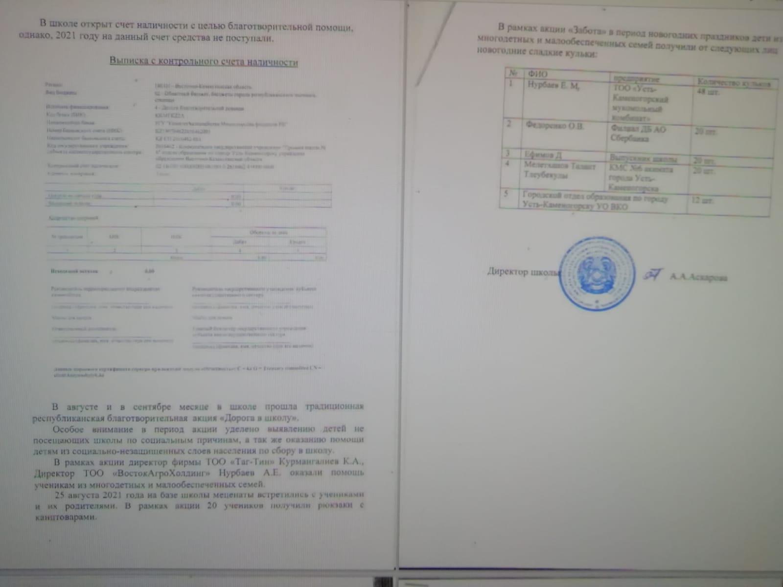 В школе открыт счет наличности с целью благотворительной помощи, однако, 2021 году на данный счет средства не поступали.